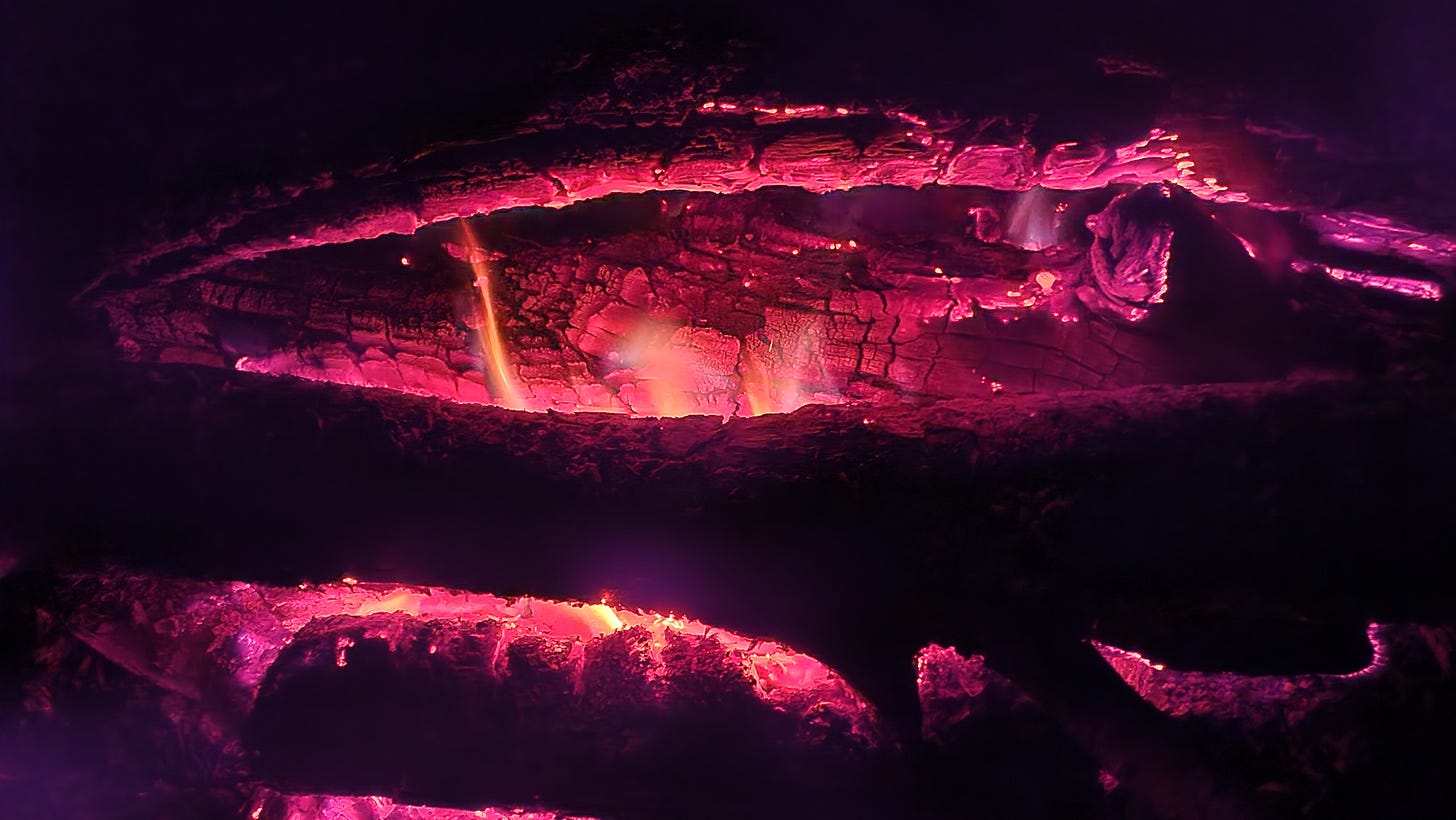 The image of the burning log is a good metaphor very finely realized with the various stages of a fire slowly dying, I especially appreciate the moment when it cracks open and flares with a lovely rush before sinking to coals:
